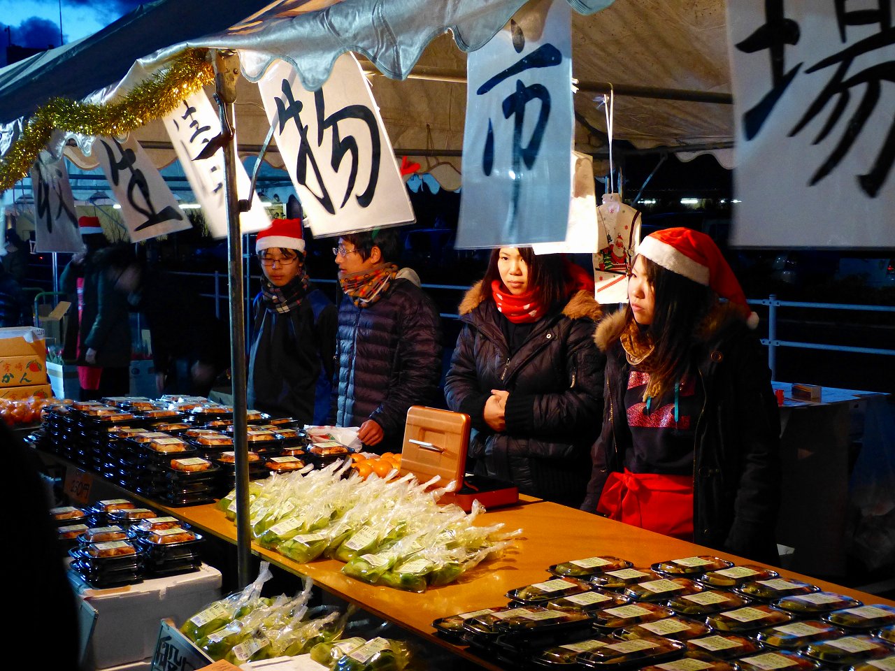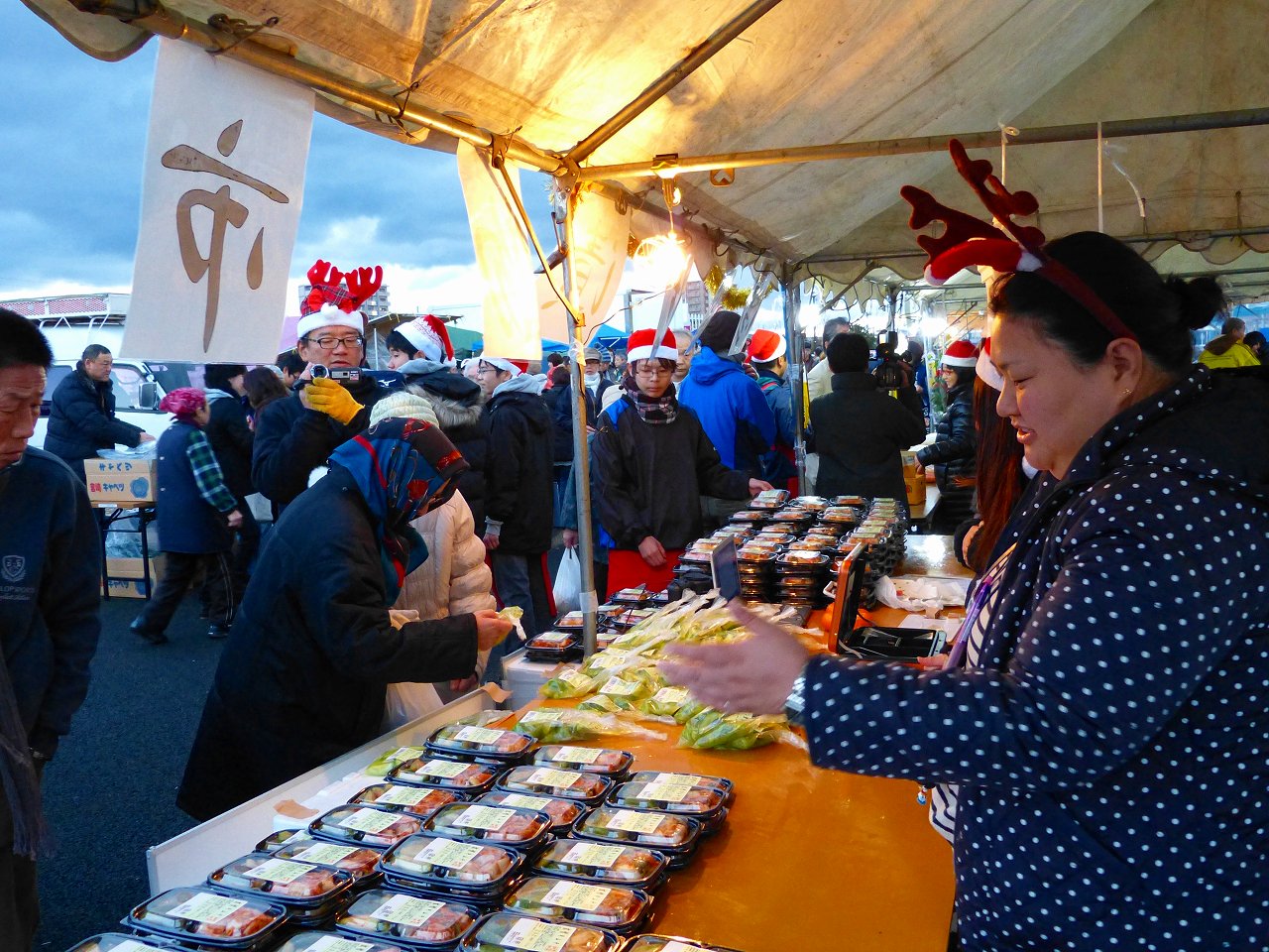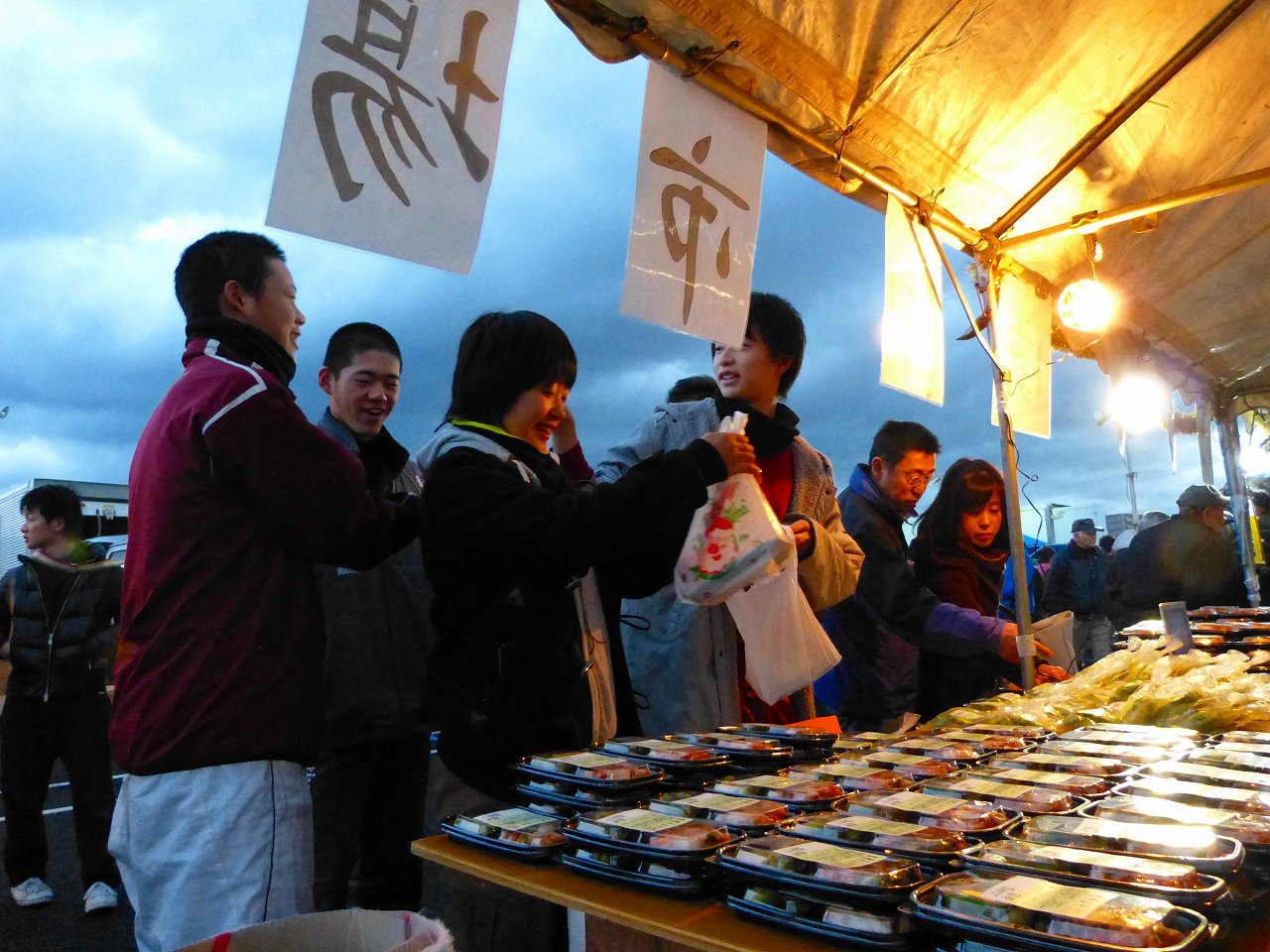 磐田:メロンの漬物、白菜キムチ。宮崎:野菜、ポインセチア、特産品。宮城:白菜、大根を販売しました。